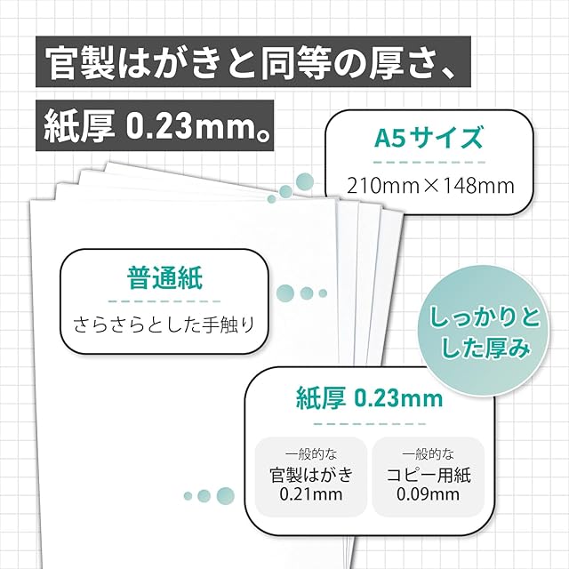 ✅【厚手A5サイズ】A5サイズの普通紙コピー用紙です。紙厚は0.23mmと超厚口で、官製はがきと同等の紙厚です。一般的なコピー用紙の2倍以上の厚みがあり、こしが感じられる仕様となっています。