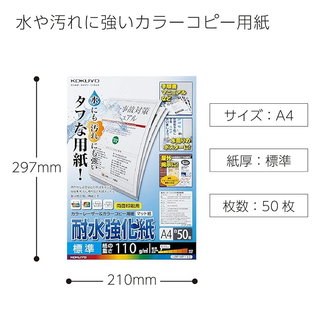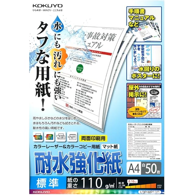 商品名:コクヨ(KOKUYO) コピー用紙 A4 耐水強化紙 マット紙 標準 紙厚0.10mm 50枚 レーザープリンタ用紙 LBP-WP110