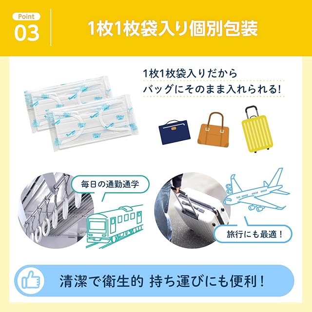 【持ち運びに便利な個包装】 1枚1枚が個別に包装されているため、通勤・お出かけ・出張・旅行などの持ち運びにも便利です。いつでも衛生的に使用できるため、バッグの中にスペア用としてやご家庭や会社などでの備蓄用にもご活用いただけます。