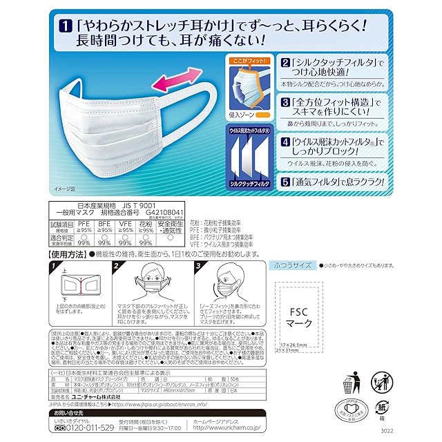 商品名:超快適マスク 風邪・花粉用 プリーツタイプ 不織布マスク 日本製 ふつうサイズ 50枚入 〔PM2.5対応 日本製 ノーズフィットつき〕 (99% ウィルス飛沫カットフィルタ) ユニチャーム