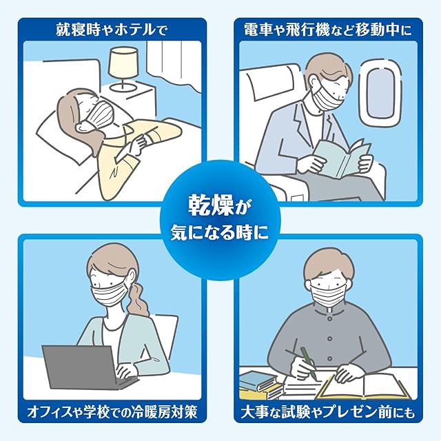 【乾燥が気になる季節の必須アイテム】<br> 就寝時やホテルで、電車や飛行機などでの移動中に、オフィスや学校などでの冷暖房対策に、大事な試験やプレゼンの前にも。<br> 乾燥が気になるこれからの季節に大活躍!<br> ヒアルロン酸&リピジュア(R)配合(※)のウェットシート付属のうるおいマスクです。※ 保水成分 <br> <br> 【水分拡散フィルタでたっぷり加湿】<br> マスク内に水分拡散フィルタを搭載。ウェットシートの水分を吸収・拡散することで加湿効果約20%アップ(※)<br> (8時間経過時の加湿効果(水分蒸発量)比較)※当社旧うるおいマスクとの比較 就寝時の使用を考慮して、鼻の部分にノーズフィッターは入っておりません。<br> <br> 【肌触りの良いシルキータッチ不織布】<br> 口元には肌触りなめらかなシルキタッチ不織布を採用しています。<br> シルキータッチ不織布はモデルパッチテスト済み(口元側生地)。<br> モデルパッチテストとはテープストリッピングにて角質を薄くした被験者によるテスト。<br> すべての方に、皮膚刺激が起こらないというわけではありません。<br> <br> 【ゆったり長めの幅広ふわふわ耳ゴム】<br> ゆったりとしたふわふわのゴムは耳が痛くなりにくいので、就寝時や移動・勉強など長時間の着用でもストレスなく快適にお使いいただけます。(当社従来品比)<br> お出かけ時の持ち運びもしやすい個別包装です。<br> <br> 【使用方法】<br> 1.ウェットシートを2つ折りのまま袋から取り出します。<br> 2.マスクのプリーツを上下に広げます。<br> 3.ウェットシートの折り目を下にして、マスク内側のポケット奥まで入れます。<br> 4.顔の大きさに合わせて再びプリーツを上下に広げます。<br> <br> 【使用上の注意】<br> ・衛生面・機能面から、ウェットシートとマスクのご使用は1回限りとし、再使用しないでください。<br> ・ウェットシートは使用直前に開封してください。<br> ・肌に異常がある場合や、かゆみ・かぶれ・発疹等の症状があらわれた時は、ただちに使用を中止し医師にご相談ください。<br> ・本品は有害な粉塵やガス等が発生する場所での使用や、それを防ぐ目的には使用できません。<br> ・においで気分が悪くなった場合には、使用を中止してください。<br> ・火気のそばでの使用はおやめください。<br> ・乳幼児や呼吸器に異常のある方には使用しないでください。<br> ・自らの意思で本品を着脱できない方は使用しないでください。<br> ・個人差等により、メガネが曇る場合がありますので運転の際などは十分にご注意ください。<br> ・ウェットシートを触った手で目をこすらないでください。<br> ・用途以外には使用しないでください。<br> ・個別包装の印刷が、まれに色移りをおこす場合があります。<br> <br> 【保管上の注意】<br> ・湿気のない清潔な所に保管してください。<br> ・乳幼児の手の届かない所に保管してください。<br> <br> 【商品詳細】<br> 内容量:15セット×2箱<br> <br>【注意事項】<br>マスクは感染(侵入)を完全に防ぐものではありません。<br><br>