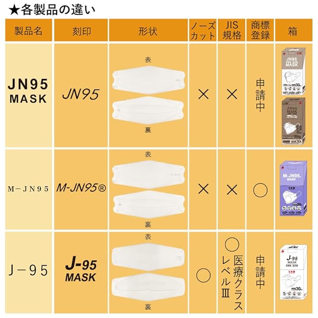【JN95に変わるNEWモデル”J-95”が誕生】 ■J-95とは■ 旧JN95マスクがJIS規格適合となり新たに生まれ変わりました!さらにクラス2の厳しい品質基準を満たした、より安心安全なマスクとなりました。 【一般JIS規格適合番号】 G42111066 【 クラス1】M12112004 【クラス2】M22112029 【 クラス3】M32201006 ※マスクについてはクラス1、2、3に分類し、必要な性能や試験方法、安全・衛生項目を規定しています