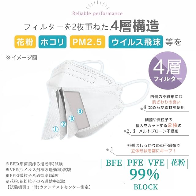 【日本国内検品済】PFE/BFE/VFE99%! BFE(細菌飛沫)・VFE(ウイルス飛沫)・PFE(微粒子)・花粉のろ過効率は99%以上です。機能検査済商品なので、ご安心してお使い出来ます!