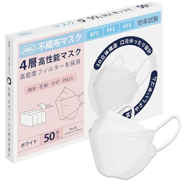 商品名:[JIMIJ] KF94型 マスク 不織布 50枚入り カラー 血色 不織布マスク ホワイト 4層 3d立体構造 使い捨てマスク 通気快適 男女兼用 ふつうサイズ