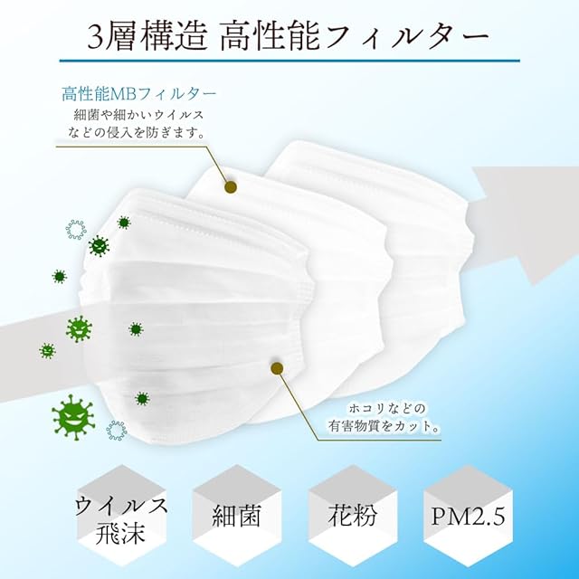 ・鼻にフィットしやすいノーズワイヤーにくわえ、オメガプリーツにより口元に空間ができるため、息ラクラク ・高級MBフィルター含む3層フィルター構造なので、ウイルス飛まつ、細菌飛まつ、花粉等の対策をしっかり行えます。