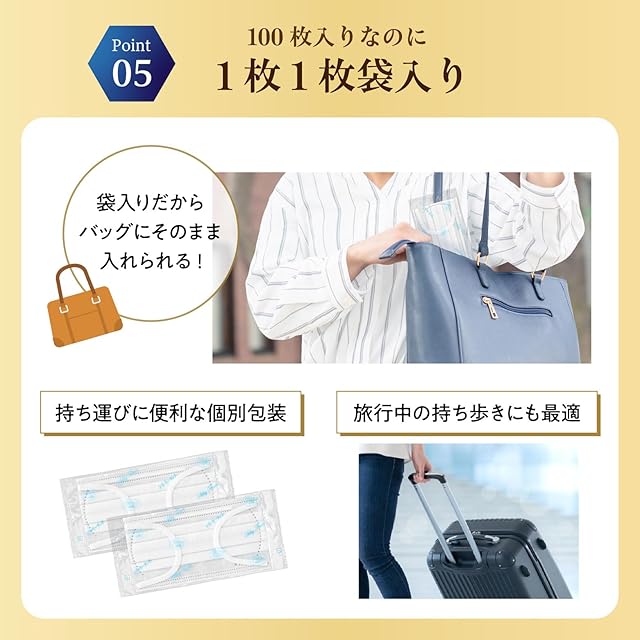 【持ち運びに便利な個包装】 1枚1枚が個別に包装されているため、通勤・お出かけ・出張・旅行などの持ち運びにも便利です。いつでも衛生的に使用できるため、バッグの中にスペア用としてやご家庭や会社などでの備蓄用にもご活用いただけます。