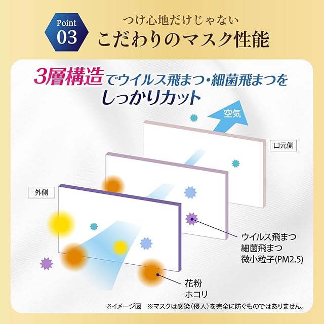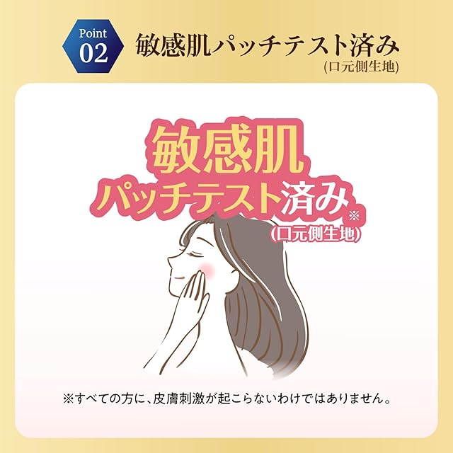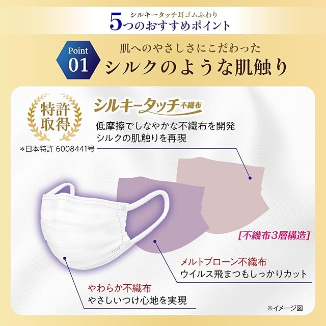 【シルクのような肌触り】口元側をシルクのような肌触りの滑らかな素材、外側はやわらかい風合いとなるような不織布を採用。直接肌に触れる部分の肌触りにこだわりました。さらに、耳かけゴムを外付けにすることで肌あたりが良くなるように工夫しています。