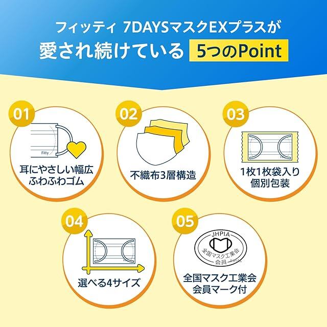 【長時間使用しても耳が痛くなりにくい】<br> 7DAYSマスク EXプラスは、ゴムを伸ばしてもゴム幅がほぼ変わらない構造であり、耳が痛くなりにくいふわふわゴムを採用しているため長時間の着用にもおすすめです。<br> 顔のラインにぴったりフィットし、立体プリーツ加工で不快な息苦しさを解消。耳かけゴムの位置が表側になっているため、肌あたりがやさしい仕様のマスクです。<br> <br> 【不織布3層構造でしっかりガード】<br> 3層構造の不織布を使用しており、かぜ・花粉・黄砂・ハウスダスト・PM2.5をしっかり対策。<br> フィルタ捕集効率試験で、細菌やウイルスを含む飛まつ、花粉や微粒子をカット(BFE試験/VFE試験/PFE試験)。<br> <br> 【持ち運びに便利な個包装】<br> 1枚1枚が個別に包装されているため、通勤・お出かけ・出張・旅行などの持ち運びにも便利です。<br> いつでも衛生的に使用できるため、バッグの中にスペア用としてやご家庭や会社などでの備蓄用にもご活用いただけます。<br> <br> 【使用方法】<br> ①表と裏を確認します。耳かけゴムが接着されている面が外側(顔にふれない面)です。<br> ②ノーズフィッターを鼻の形に合わせます。<br> ③顔にフィットさせながら耳かけゴムを掛けます。<br> ④顔の大きさに合わせてプリーツを上下に広げます。<br> <br> 【商品詳細】<br> 内容量:100枚入り(50枚×2箱)/サイズ:ふつう/マスクサイズ:16.5cm×9cm/カラー:ホワイト(白)<br> <br> 【注意事項】<br> マスクは感染(侵入)を完全に防ぐものではありません。<br> <br>