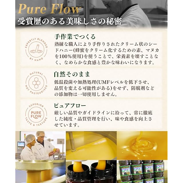 【Pure Flow:受賞歴のある美味しさの秘密はピュアフロー製法】常に徹底した純度・品質管理を行い、味や食感を向上させています。熟練の職人によって手作りされたシードハニー(マヌカの蜂蜜100%でつくったクリーム化する素)を使うことで栄養素を壊すことなく、なめらかな食感と豊かな味わいに仕上げたマヌカハニーです。