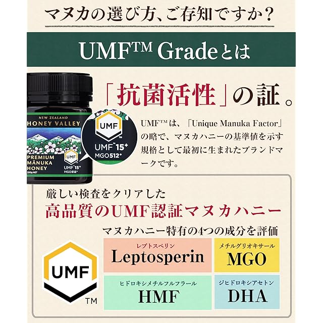 【UMF:ニュージーランド政府公認の品質システム】UMF(ユニーク・マヌカ・ファクター)認証は、マヌカハニーの純度と品質がされた証です。MGO(メチルグリオキサール)、DHA(ジヒドロキシアセトン)、HMF(ヒドロキシメチルフルフラール)、Leptosperin(レプトスペリン)の4つの特有成分からUMFグレードが決定されます。