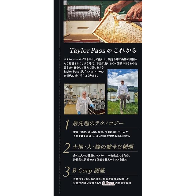 米国の「B corp(ビーコープ)」認証のハイクオリティ・サステナブル・最新鋭のTaylorPass社がつくるUMFマヌカハニー。UMF協会認定。健康管理を目的とした方や効果を実感したい方にオススメの数値です。