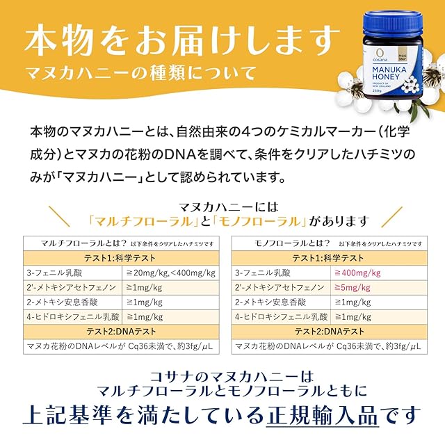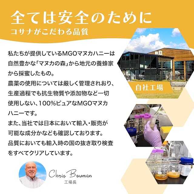 本品は、cosanaのニュージーランド現地法人であるCOSANA NEW ZEALAND LIMETEDが製造しています。厳しい検査(農薬分析、抗生物質、添加物未検出等)はもちろんこと、ニュージーランド政府機関であるMPIの基準をクリアしたMGOマヌカハニーです。加えて日本国内で全数外観検品と抜き取りでMGOの再分析を実施しダブルチェックする事で厳格な品質管理を行っています。