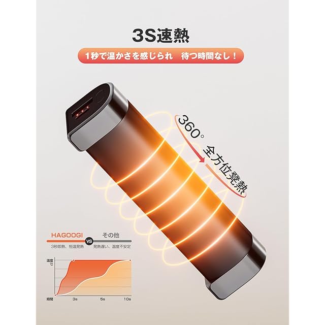 【360°急速発熱】HAGOOGI電気カイロの表面は熱伝導率のよいアルミニウム合金を採用し、360度全方向から発熱させることができる円筒形に設計され、寒い時期は待つ時間なし、スイッチを入れるとすぐに暖かくなります。また、最新のMCUチップとサーモスタッドが搭載され、急速発熱を実現する同時に恒温機能もできて、一定の温度になると過度な温度の上昇あるいは温度低下を防いでくれるため、安心して使うことができます