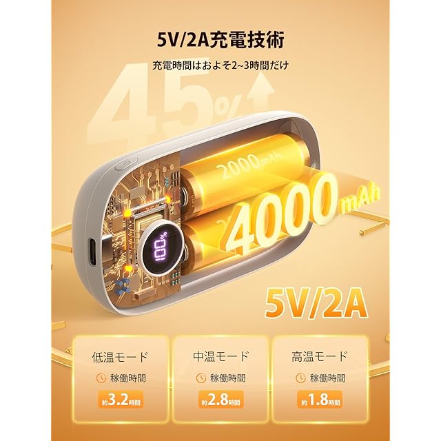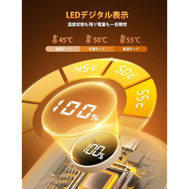 【3階段温度調整・操作簡単・ディスプレイ表示】3段階の温度(低温45℃、中温50℃、高温55℃)設定があります。モード切り替えボタンを短押しして、環境温度によって適切な温度を調節できます。不要な時は長押しすると電源が切れるのもとても便利です。搭載されたLEDデジタルスクリーンに残り電量と温度を表示します。温度状態が一目瞭然だけではなく、いつでも電気残量を知ることもでき、必要に応じて充電できます。