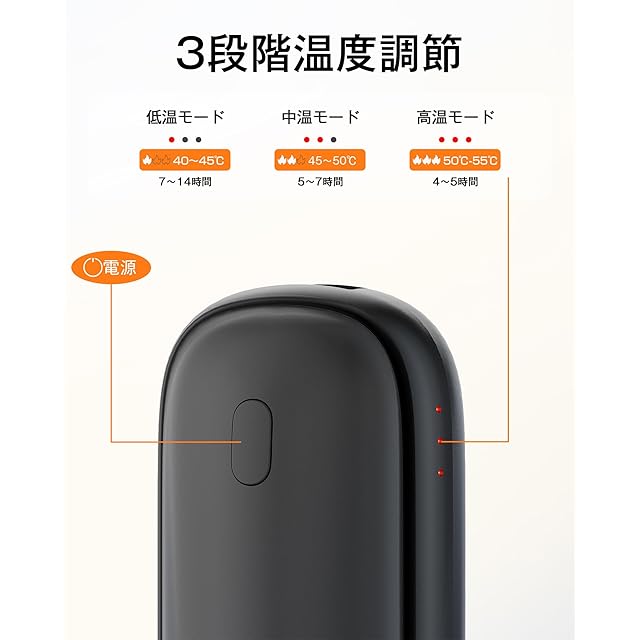 【3段階温度調節で好みの温度にカスタマイズ】YUSIDOカイロは、環境や体調に合わせて3段階の温度調節が可能です。低温モード(40~45℃)、中温モード(45~50℃)、高温モード(50~55℃)の中から、お好みの温度に設定できるため、どんな場面でも快適に過ごせます。長時間の使用にも耐え、低温モードで7-14時間、中温モードで5-7時間、高温モードで4-5時間。(2つカイロの使用時間総合です。)(実際の使用時間は、環境や使用状況などにより異なる場合があります。)寒い季節に最適な一台です。