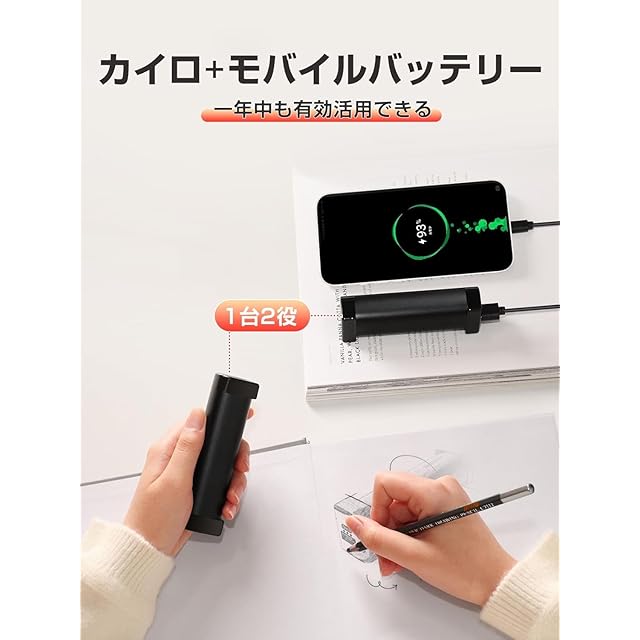 【1台2役・大容量10000mAh】カイロにもモバイルバッテリーにもなる、冬の最強マルチアイテム! 10000mAh(5000mAh×2)の大容量バッテリー搭載、ハンドウォーマーとしてだけでなく、スマホ・タブットなどの充電も可能。1つを温めながら、もう1つで充電。外出がぐっと楽になる!【最大連続14時間の暖かさ】温度モードに応じて、しっかり長時間発熱:低温モード:約7~14時間、中温モード:約5~7時間、高温モード:約4~6時間(※使用時間は2つのカイロの合計で、周囲温度や使用状況により変動することがあります。)この冬は、暖かさと充電の心配を、ひとつに。