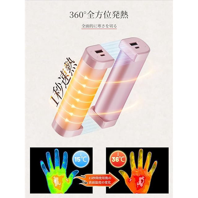 【1秒でポカポカ!360°全面発熱】充電するだけで、繰り返し使えるエコなカイロが新登場!寒さが厳しい日でも、スイッチを入れてたった1秒ですぐ温もりを実感。手先の冷えが気になる時も、サッと取り出して即効暖まろう。 360°全面発熱設計で、どこを持ってもまんべんなく温かく。握り方や置き場所を選ばず、じんわり持続的なあたたかさが続きます。 繰り返し充電可能なので、使い捨てカイロよりも経済的&地球に優しい。高い保温性能で、アウトドアや通勤・通学、オフィスでも大活躍!