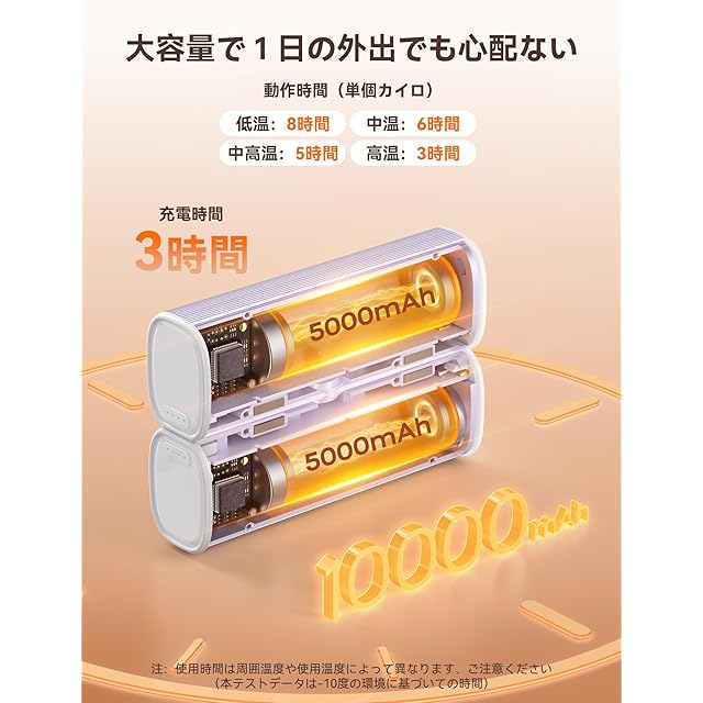 【10000mah大容量で最大10時間連続使用可・2個セットで友達や家族とシェアできる】冬の長時間屋外作業や活動の際は、長持ちするカイロが欠かせません。RORRY社の充電式カイロは、合計10000mAh(1個あたり5000mAh)の大容量バッテリーを搭載しており、約3時間の短時間充電で満タンになります。低温モードでは、2個合わせてなんと10時間以上もの長時間、じんわりとした温かみを提供し続けるので、一日中使い続けても充電の心配が大幅に減り、充電頻度を抑えたい方にぴったりです。さらに、このカイロの魅力はユニークなマグネット式デザインにあります。2本のスティックタイプを簡単に吸着させてまとめることができ、持ち運びや収納に便利です。また、分離すればそれぞれ独立して使用可能なので、左右のポケットに一本ずつ入れて両手を温めたり、家族や友人と1本ずつシェアして温かみを分け合ったりと、用途に応じて柔軟に使い分けることができます。加えて、本体には残量表示とモードインジケーターランプが装備されており、設定温度や電池残量が一目で分かるため、いつ充電すればよいかを見逃すことがありません。