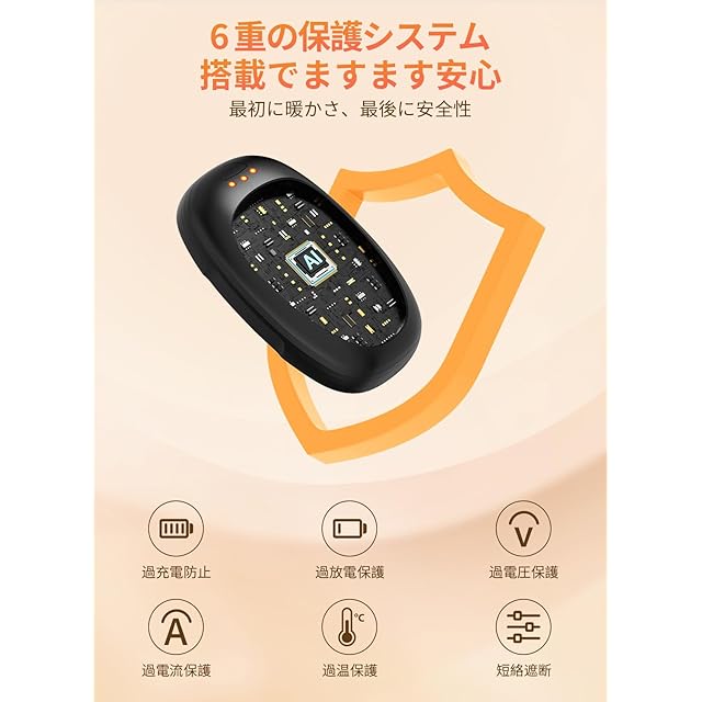 「安全性設計・安心して使える」抜群な柔軟性と耐衝撃性を備えたABS材質、熱伝導率と熱放散性能が付いているアルミ合金素材、耐高温PCの三つ優れた安全性と耐久性の素材を利用する同時に、心強い多重保護システムも付いている充電カイロです。放電、過熱、過電圧、過電流、過負荷、短絡などのリスクに防ぎ、安全性が向上させています。安全性が充分に考慮して長期間で安心にご利用いただけます。