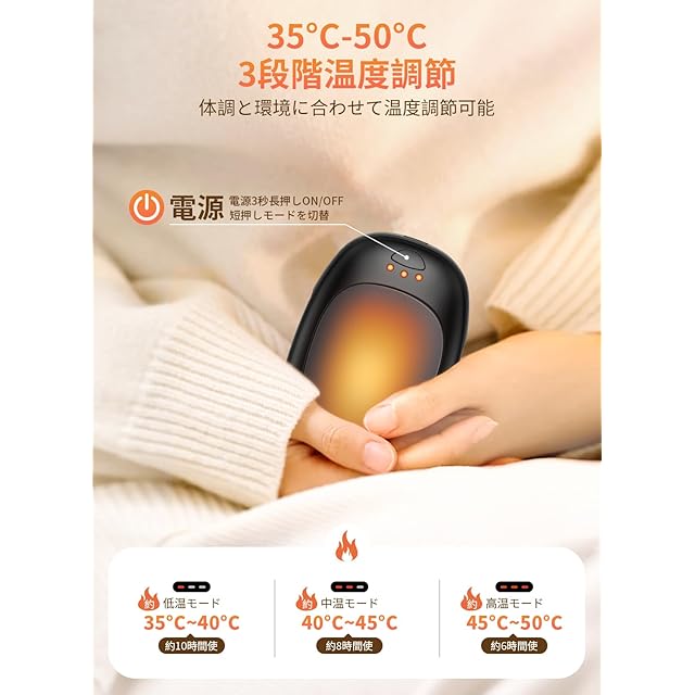 「3段温度調節」ボタンを3秒長押してから、赤のライプが点灯するとカイロ状態になり、操作も簡単。同時に、温度調節機能を搭載して、3段階の低温・中温・高温から適切な温度まで調節ができます。低温モード(1つの赤いライト):35-40℃;中温モード(2つの赤いライト):40-45℃;高温モード(3つの赤いライト):45-50℃。ご注意:低温火傷を防ぐため、電気カイロが高温モードで同じボディパーツを長時間使用しないでください。
