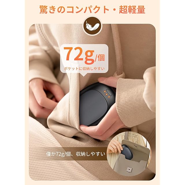 「超軽量コンパクト・携帯便利」1個の重量はわずか72gで、女性やお子様もストレスなく握りやすく、二個並べる場合の本体サイズは幅94*57*37mmで、収納・持ち運びやすいです。スマホより小さいカイロはポケットを入る可能なので、持ち歩いできます。家、会社、通勤、通学、キャンプなどの場所はピッタリです。これから、冬場で暖かい電気式カイロを持って、快適な生活を目指します。