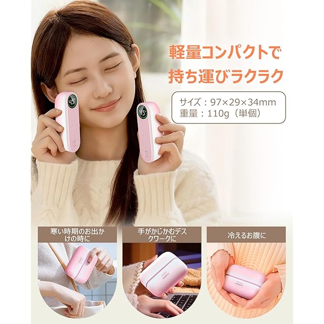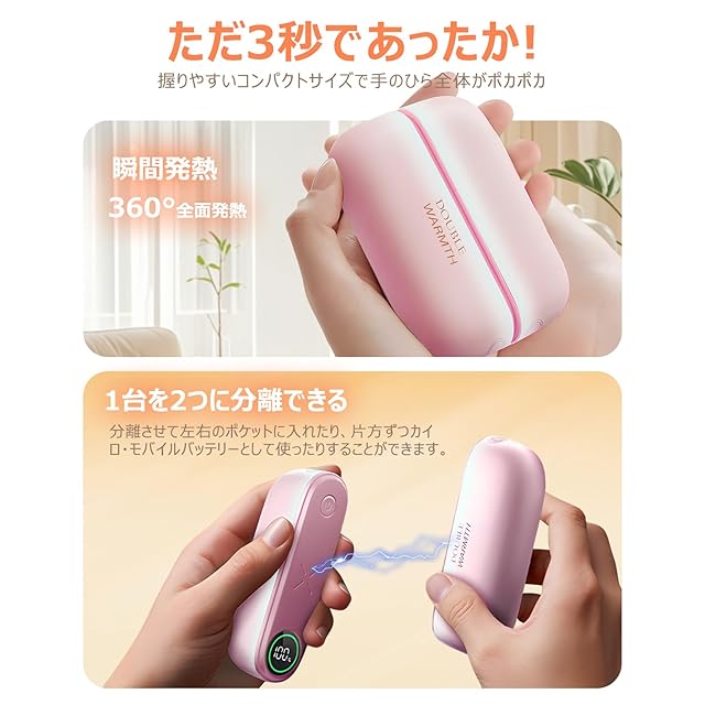 【2025冬限定カラー】2025年冬限定カラーはオシャレでかわいらしい仕上がりにあるグラデーションの「ピンク」です。【マグネット分離式&わずか3秒で急速全方位発熱】手のひら全体を温めて、2つに分かれる「シェア充電式カイロ」が2025新登場!薄型ながらバッテリーチャージャーとしても使え、いざという時にも頼りになる機能的なアイテムです。カイロ本体は2つに分けて使用する分離型だからひとりで両手で握って温めたり、ふたりで仲良くシェアもできます。電源を入れて約3秒で素早く温まります。冷えた指先を瞬時に温めます。寒い冬のちょっとしたお出かけやアウトドアシーンでも、手のひらに温もりをお届けします。