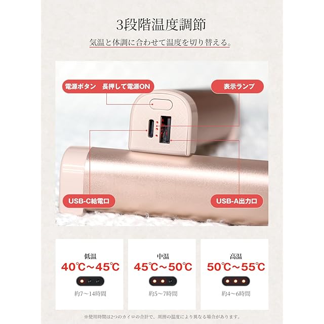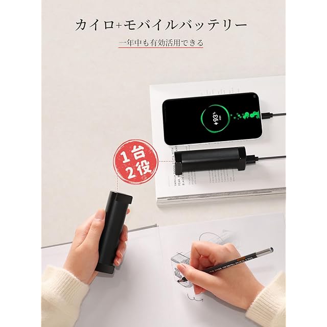 【1台2役・大容量10000mAh】カイロにもモバイルバッテリーにもなる、冬の最強マルチアイテム! 10000mAh(5000mAh×2)の大容量バッテリー搭載、ハンドウォーマーとしてだけでなく、スマホ・タブットなどの充電も可能。1つを温めながら、もう1つで充電。外出がぐっと楽になる!【最大連続14時間の暖かさ】温度モードに応じて、しっかり長時間発熱:低温モード:約7~14時間、中温モード:約5~7時間、高温モード:約4~6時間(※使用時間は2つのカイロの合計で、周囲温度や使用状況により変動することがあります。)この冬は、暖かさと充電の心配を、ひとつに。