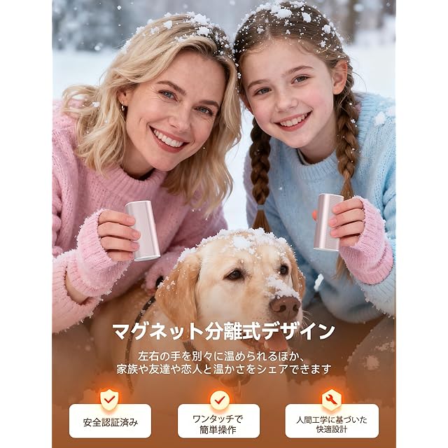 【超小型超軽量・収納兼充電一体型のスタンド付】スポーツの観戦や屋外イベント、アウトドアなどのシーンでは、持ち運びが便利なカイロがあると、冬の悩みを一挙に解決できますよ!RORRY社のこのカイロは、サイズが7.8×3.4×2.7cmのミニサイズで、1個あたりの重量は約105gと非常に軽量で、毎日の荷物に加えても全く負担になりません。スタイリッシュな円筒形デザインで,手のひら全体でしっかり握れて、冷えきった手指をポカポカに温めます!また、手のひらにおさまる小型モデルのため、手にフィットしやすく気軽に持ち運べ、小さい子どもから大人まで使用できます。さらに、充電と収納が一体型の充電スタンドが付属して,スタンドに置くだけで同時に2個のカイロを充電できる上、カイロの紛失や破損を防ぎます!ケーブルと接続した状態を維持することで、常に充電された状態で使えるようサポートしてくれます。さらに、本体にはTYPE-Cポートを装備して、USBケーブルで直接充電もOKです(※出力非対応のため、モバイルバッテリーとしては利用できません)。