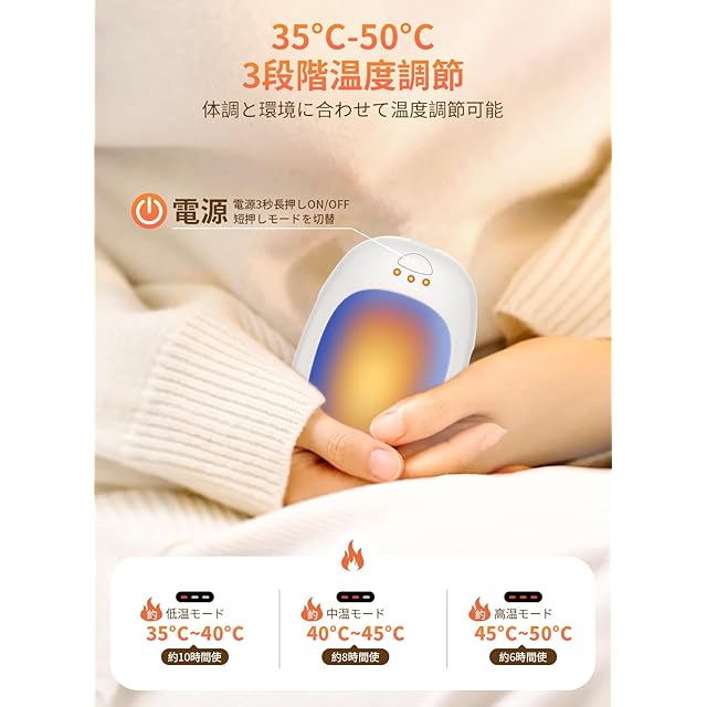 「3段温度調節」ボタンを3秒長押してから、赤のライプが点灯するとカイロ状態になり、操作も簡単。同時に、温度調節機能を搭載して、3段階の低温・中温・高温から適切な温度まで調節ができます。低温モード(1つの赤いライト):35-40℃;中温モード(2つの赤いライト):40-45℃;高温モード(3つの赤いライト):45-50℃。ご注意:低温火傷を防ぐため、電気カイロが高温モードで同じボディパーツを長時間使用しないでください。