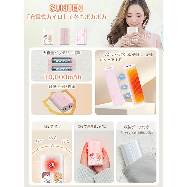 商品名:【日本限定】SUKITEN 充電式カイロ 10,000mAh大容量 3秒急速発熱 3段階温度調節 全面発熱 モバイルバッテリー機能 電気カイロ 超軽量 マグネット分離式 5V/2A急速充電 便利グッズ 持ち運びやすい PSE認証済み 寒さ対策 旅行 アウトドア 出張 通勤 プレゼント 2個セット