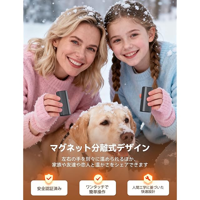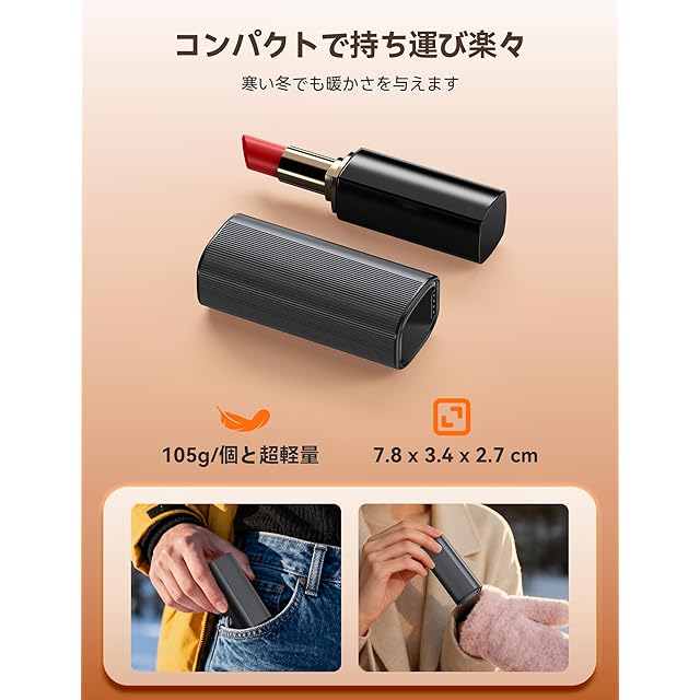 【超小型超軽量・収納兼充電一体型のスタンド付】スポーツの観戦や屋外イベント、アウトドアなどのシーンでは、持ち運びが便利なカイロがあると、冬の悩みを一挙に解決できますよ!RORRY社のこのカイロは、サイズが7.8×3.4×2.7cmのミニサイズで、1個あたりの重量は約105gと非常に軽量で、毎日の荷物に加えても全く負担になりません。スタイリッシュな円筒形デザインで,手のひら全体でしっかり握れて、冷えきった手指をポカポカに温めます!また、手のひらにおさまる小型モデルのため、手にフィットしやすく気軽に持ち運べ、小さい子どもから大人まで使用できます。さらに、充電と収納が一体型の充電スタンドが付属して,スタンドに置くだけで同時に2個のカイロを充電できる上、カイロの紛失や破損を防ぎます!ケーブルと接続した状態を維持することで、常に充電された状態で使えるようサポートしてくれます。さらに、本体にはTYPE-Cポートを装備して、USBケーブルで直接充電もOKです(※出力非対応のため、モバイルバッテリーとしては利用できません)。