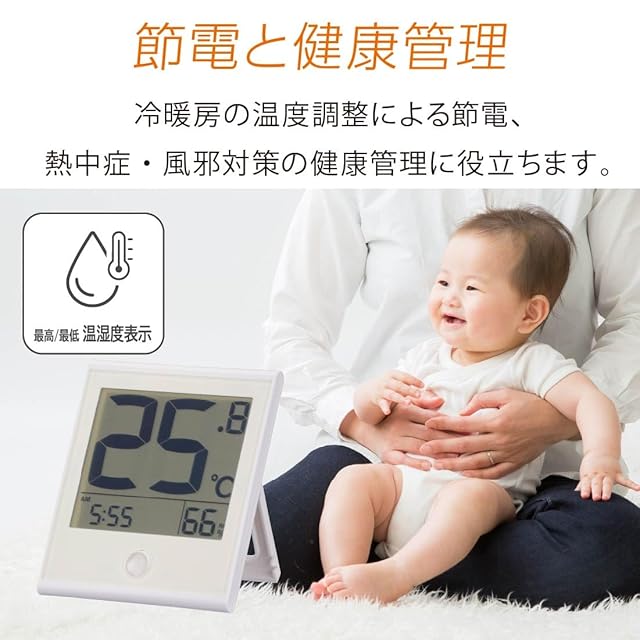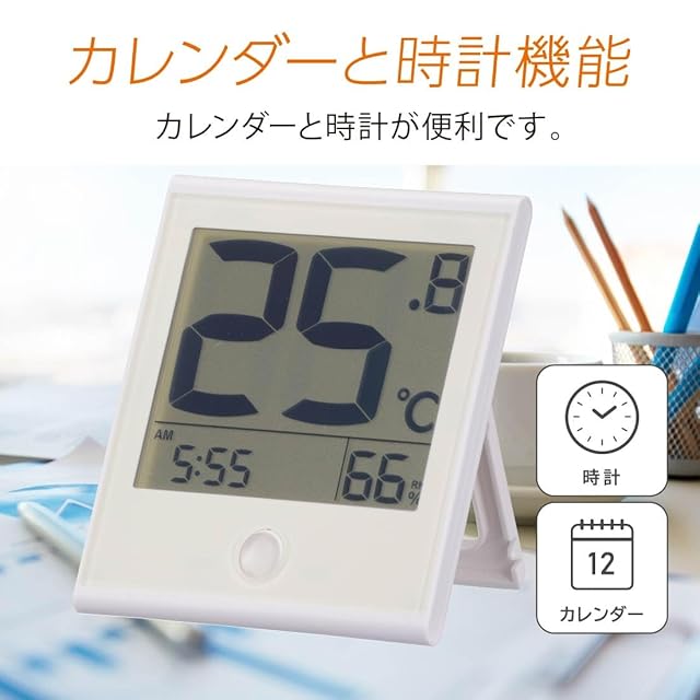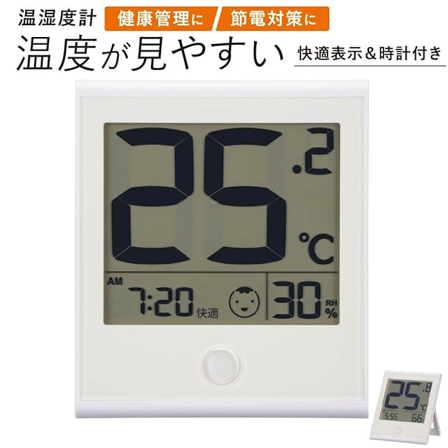 【 特 長 】 ◆冷暖房の温度調整による節電や、熱中症・風邪対策の健康管理に役立ちます ◆見やすい大画面表示 ◆最高・最低温湿度を表示するメモリー機能付き ◆快適表示機能付き ◆カレンダー表示・時計機能付き ◆置き掛け両用 ◆本体カラーはホワイト