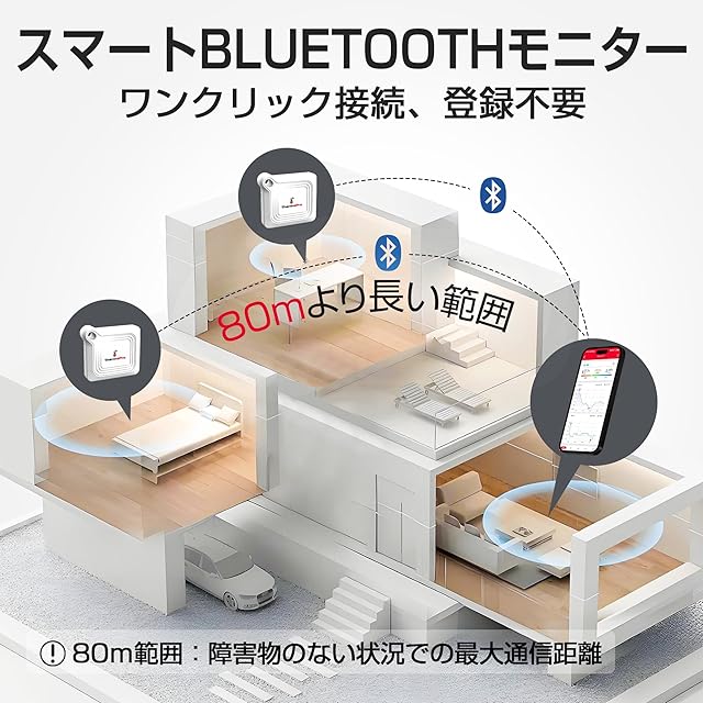 【より簡単なBluetooth接続】高度な自動接続テクノロジーを備えており、この無線温度計とスマートフォンを簡単にペアリングできます。付属の電池を入れ、アプリをダウンロードするだけですぐに使うことができます。あらゆる年齢や技術レベルのユーザーに最適です。ワイヤレス温度計のBluetooth通信距離は障害物のない状況で最大80メートルまでです。