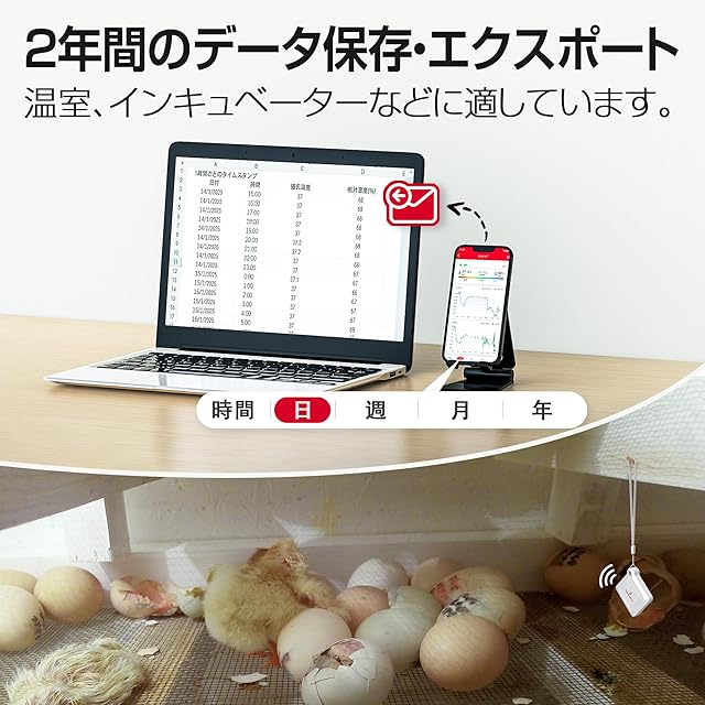 【履歴データ記録とエクスポート】アプリには現在の温湿度状況および快適度だけではなく、デジタル温度湿度計の過去1年間のデータもオンラインで追跡でき、時間・曜日・月ごとの温湿度の変化をグラフで直観的に見ることができます。室内環境の快適度変化が一目でわかり、加湿器やエアコンの適切な調整に役立ちます。また、分析用に最大で過去2年間の履歴データ(CSVファイル)を簡単にエクスポート可能です。