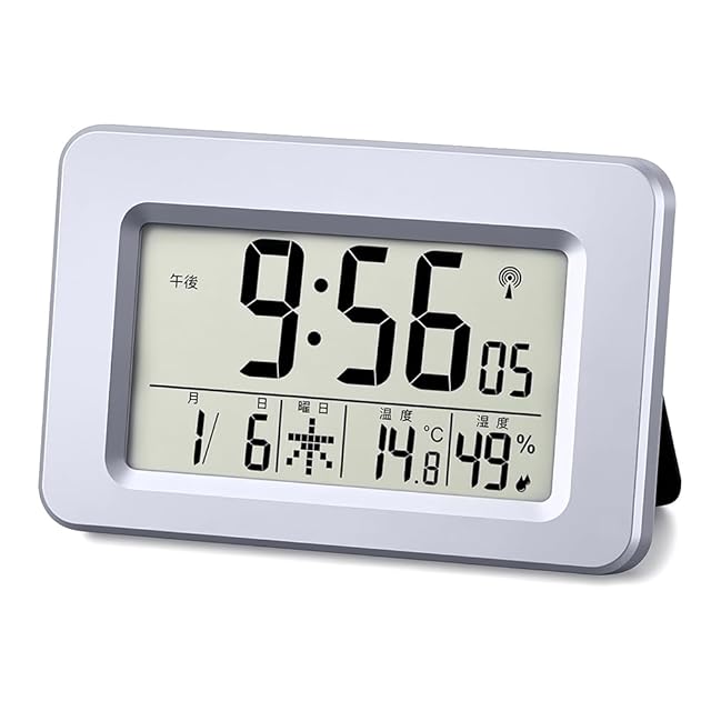 商品名:電波時計 置き時計 目覚まし時計 温度湿度計 LEDバックライト デジタル 掛け時計 カレンダー 日付・曜日表示 単4形電池対応 寝室・卓上用 本体サイズ:13.6×9×2.1cm (シルバー)