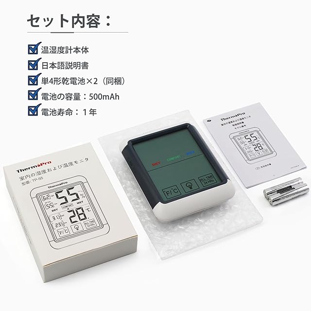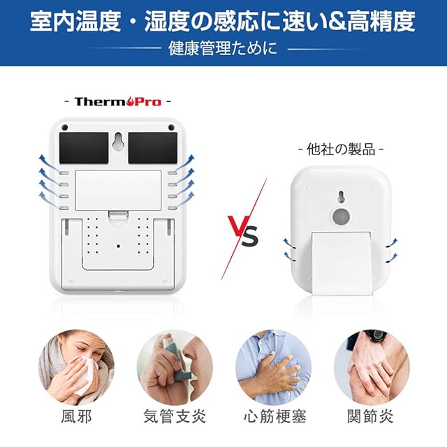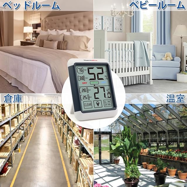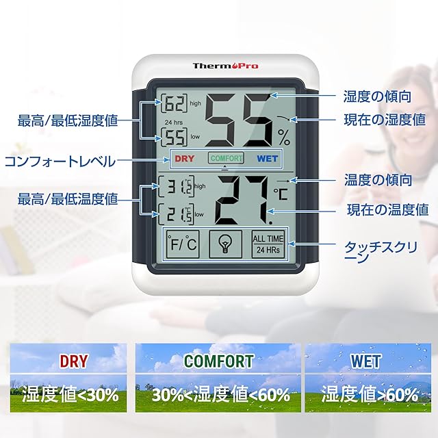 商品名:ThermoProサーモプロ 湿度計 温度計 デジタル 温湿度計 室内 LCD大画面 最高最低温湿度表示 バックライト機能 タッチスクリーン 置き掛け両用 マグネット付 TP55