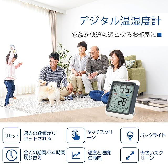 【バックライトとタッチパネル機能】温室度計はタッチパネルとバックライト機能があるから、薄暗い所でも設定と読むのは便利になります。 【多機能デジタル温湿度計】湿度と温度の測定間隔は約10秒で、正確な温湿度値が提供出来ます。同時に湿度のレベルアイコンは現在の空気状態を表示します-- 乾燥/快適/不快 【最高最低温湿度の表示】現在の室温と湿度が見やすく表示され、同時に最高最低の数値も表示されます。この最高と最低のデータは24時間で自動リセットか、リセットするまでの全ての期間での最高最低を表示するのかをボタンひとつで切り替えられます。 【室温計の測定範囲】:温度(-50 °C ~ 70 °C)、湿度(10% ~ 99% RH)、表示単位:温度(0.1℃)、湿度(1%RH)。本体サイズ:11cm×8.5cm×2.4cm。 【三つの設置方法】室内温度湿度計は卓上スタンド・マグネット・壁掛け用フック穴が付いているので、自宅の様々な場所に設置出来ます。単四電池(1.5V)が含まれます。