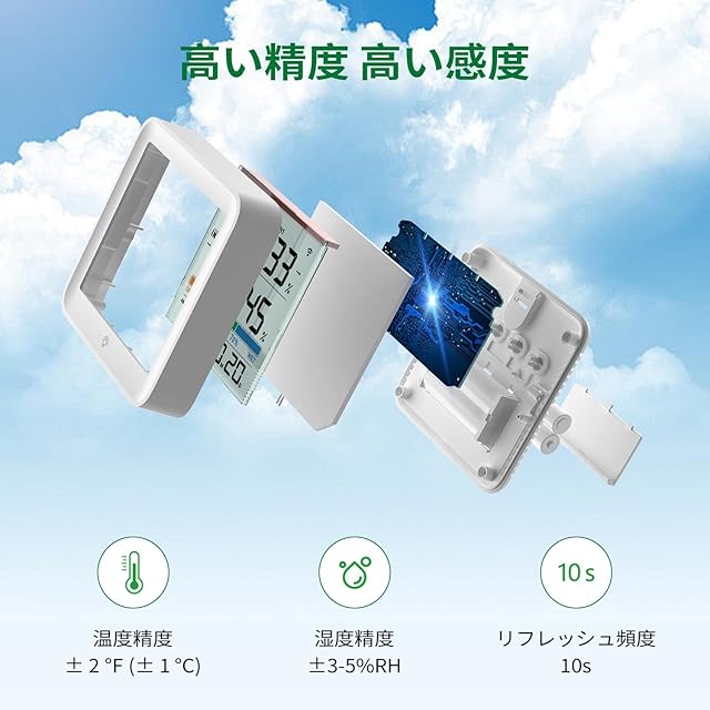 【高精度・高性能】デジタル温度・湿度の測定値は10秒ごとに更新され、最新のデータを提供します。広い測定範囲 室内温度範囲:-10℃~60℃(14℉~140℉).屋外温度範囲:-40℃~60℃(-40℉~140℉)。湿度:10%~99%;屋内外の測定精度:±1℃(温度),± 3-5% RH(湿度)