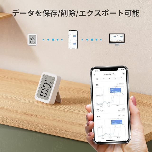 【データ保存&データエクスポート】ローカルストレージでデータを68日間保存でき、SwitchBotハブシリーズと連携して2年間保存できます。温度・湿度がグラフで可視化し、グラフの折れ線をタップすれば、特定時刻の履歴データを確認可能。データ(CSVファイル)をエクスポートでき、過去の温湿度変化を確認できます。
