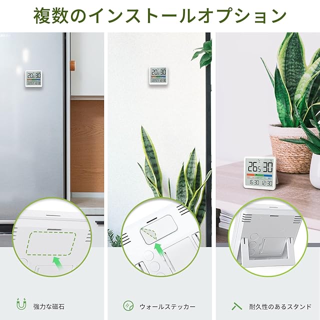 【多種類の設置方法】室温計はキッチンや寝室など室内のあらゆる場所で使いやすいように磁石(強力マグネット)、壁掛け、スタンドの3wayで使用ができます。マグネットで冷蔵庫につけたり、卓上で使ったりなど生活のシーンに合わせて設置ができます。