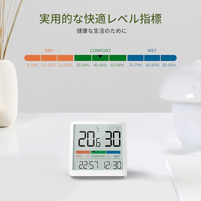 【快適度がひと目でわかる】温度・湿度計は「DRY乾燥(湿度30%以下)、COMFORT快適(湿度30~69%)、WET湿った(湿度70%以上)」の3段階で快適レベルを表示するので一目で分かりやすいです。