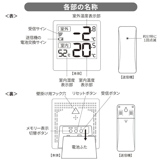 ◆質量:本体…約76g/送信機…約30g (電池含まず) ◆材質:本体・送信機…ABS樹脂、表示画面…LCD、パネル部…アクリル ◆使用電源:本体…DC3V 単4形乾電池×2本(別売)、送信機…DC3V 単4形乾電池×2本(別売)