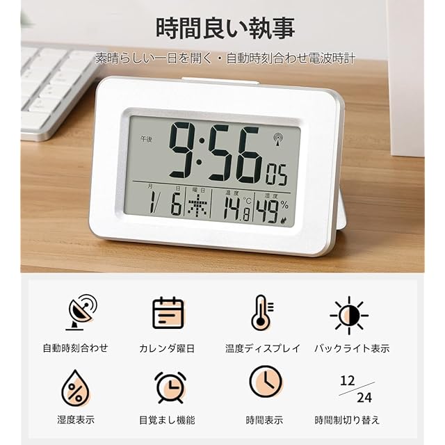 【商品の機能】2000-2099年までのフルオートカレンダー機能、温湿度表示(温度測定範囲:0℃~50℃ 測定精度: ±2℃ 湿度測定範囲:20%-95% 測定精度:±8%(25℃)、電波受信機能、LEDバックライト、目覚まし時計のアラーム、温度表示、湿度表示、カレンダー表示、曜日表示、12/24時間表示切替。