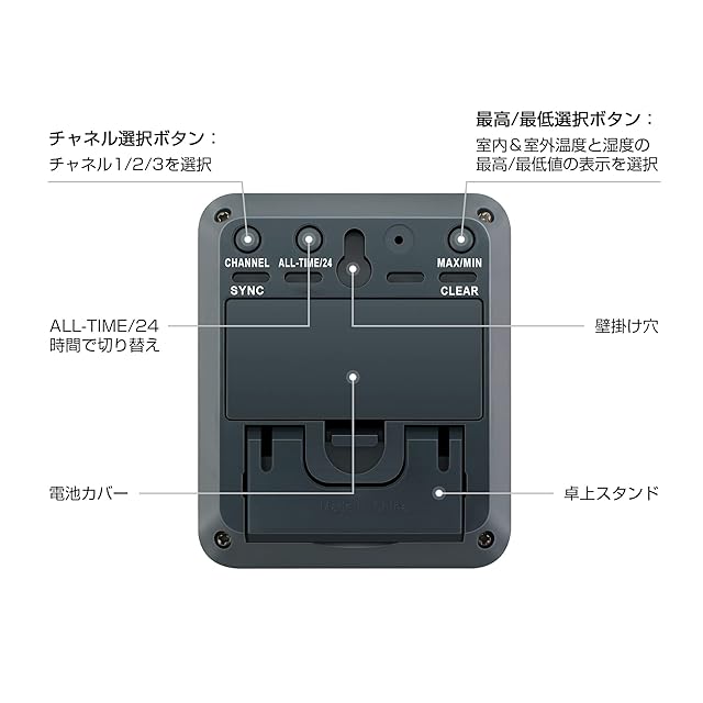 【最高最低温湿度の表示】温度 湿度計は現在の室内と屋外の室温・湿度を測定して、同時に最高最低の数値も表示されます。この最高と最低のデータは24時間で自動リセットか、リセットするまでの全ての期間での最高最低を表示するのかを背面ボタンひとつで切り替えられます。