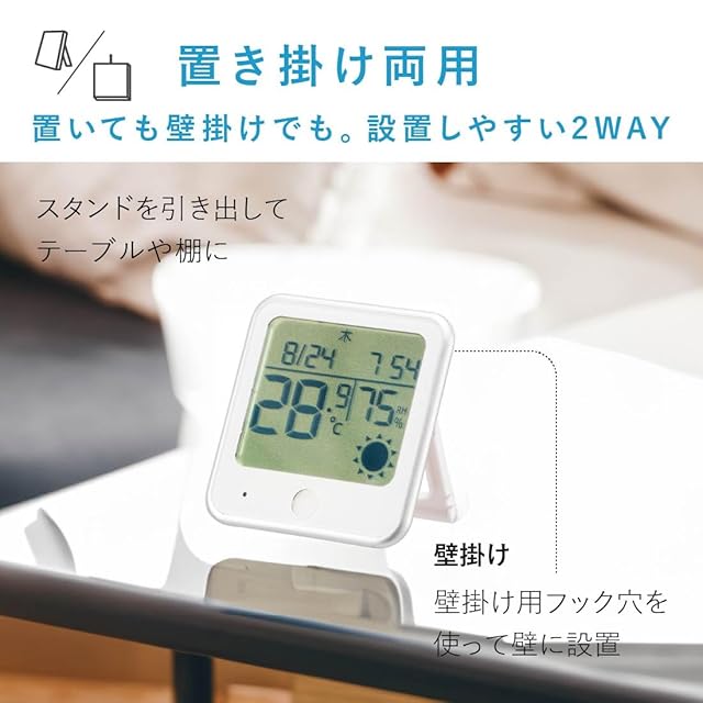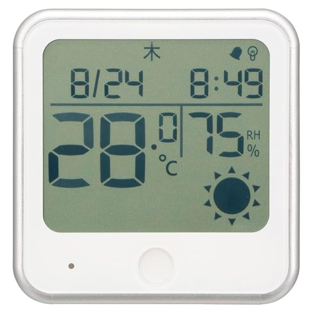 【 仕 様 】 ◆温度表示範囲:-5~40℃ ◆温度測定精度:10~40℃で±2℃ 左記以外で±5℃ ◆湿度表示範囲:20~95% ◆湿度測定精度:40~80%で±8% 左記以外で±10% ◆時計精度:約±40秒/月 ◆外形寸法:(約)幅95×高さ98×奥行21mm