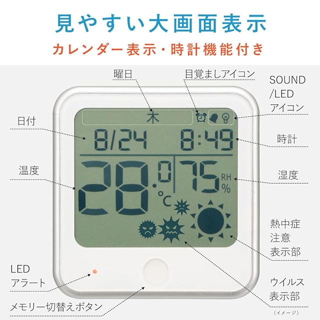 【 特 長 】 ◆冷暖房の温度調整による節電や、熱中症・風邪対策の健康管理に役立ちます ◆見やすい大画面表示 ◆最高・最低温湿度を表示するメモリー機能付き ◆インフルエンザ・熱中症注意機能付き ◆カレンダー表示・時計機能付き ◆本体カラーはホワイト