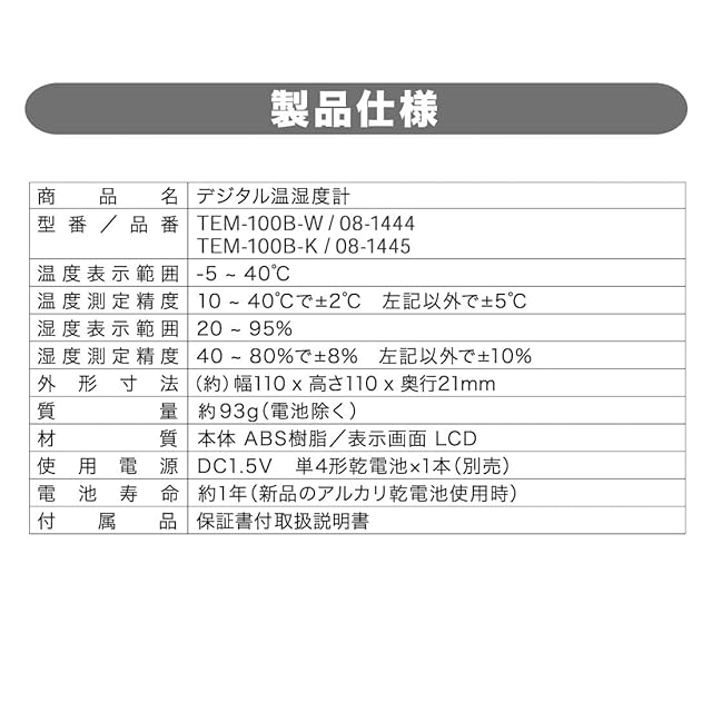 【 仕 様 】 ◆温度表示範囲:-5~40℃ ◆温度測定精度:10~40℃で±2℃ 左記以外で±5℃ ◆湿度表示範囲:20~95% ◆湿度測定精度:40~80%で±8% 左記以外で±10% ◆外形寸法:(約)幅110×高さ110×奥行21mm ◆質量:約93g(電池除く)