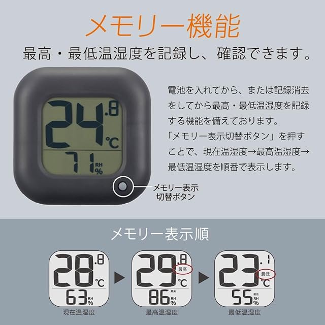 【 特 長 】 ◆冷暖房の温度調整による節電や、熱中症・風邪対策の健康管理に役立ちます ◆見やすい大画面表示 ◆最高・最低温湿度を表示するメモリー機能付き ◆置き・掛け両用 ◆シンプルデザイン ◆本体カラーはブラック