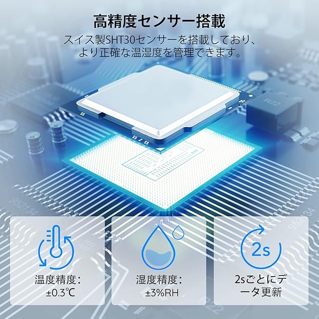 【高精度センサー搭載】スイス製のSHT30センサーを内蔵し、温度は最大±0.3°C、湿度は最大±3%RHの誤差で 、高精度で信頼性の高い温湿度測定を実現できます。また、2秒ごとにデータを更新し、精度と感度両方とも優れているデジタル温湿度計です。