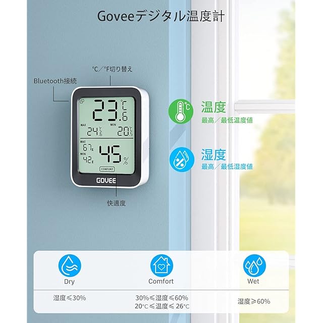 <b>お部屋の潤いチェック</b><br><br> <b>熱中症対策</b><br><br> <b>老人やベビーのケア </b><br><br> <b>ペットなどのお世話に欠かせないGoveeデジタル温湿度計</b><br><br> <b>80m遠隔コントロール</b><br><br> Bluetooth温湿度計なので、最大80m遠隔コントロールでき、 お自宅でいつでもどこでも温湿度状況をよく知れます。</b><br><br> <b>高精度</b><br><br>スイ ス製SHT30センサーを内蔵し、温度は最大±0.3°C、湿度は最大±3%RHの誤差です。また、2秒ごとにデータ を更新し、精度と感度両方とも優れています 。</b><br><br> <b>温湿度異常アラーム機能 </b><br><br> 設定された温湿度範囲を超えると、アプリは自動的に携帯電話に通知を受信します。緊急 状況にとても役に立ちます。</b><br><br> <b>シンプルで置掛兼用</b><br><br> 超きれいな3イン チLCD大画面、シンプル、おしゃれな欧米風のデザイン、お部屋になじみます。卓上に置くだけでなく、壁掛けもでき ます。とても便利です。</b><br><br> <b>[Govee Home]アプリで使用に</b><br><br> 1. [Govee Home]アプリをダウンロード</b><br><br> 2.Bluetoothをオンに</b><br><br> 3.“ H5075”という名前の設備を選択</b><br><br> 4.温湿度計と[Govee Home]アプリに連接 </b><br><br> 5.アプリでご使用ください。</b><br><br> <b>製品の仕様</b><br><br> Bluetooth距離:80m</b><br><br> 温度範囲:0°C ~ 50°C</b><br><br> 湿度範囲: 0% ~99% </b><br><br> 温度精度:±0.3°C </b><br><br> 湿度精度: ±3% RH</b><br><br> 電池: 乾電池 X2(1.5V)</b><br><br> 測定頻度:2 秒 </b><br><br> 本体サイズ:10*7*3(CM)</b><br><br> 使い方:卓上スタンド 壁掛け </b><br><br> <b>パッケージ内容</b><br><br> スマート温湿度計*1</b><br><br> AAA 電池*2</b><br><br> 日本語取扱説明書*1</b><br><br> 感謝カード*1 </b><br><br>